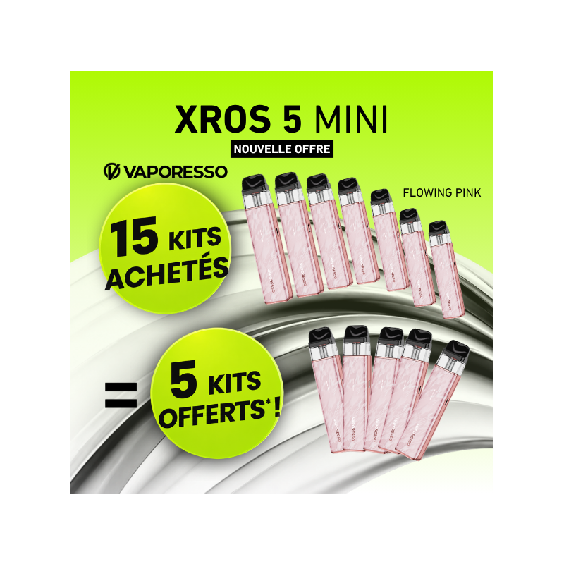 Pour l'achat de 15 Kits XROS 5 Mini de Vaporesso (couleur Flowing Pink), recevez gratuitement 5 Kits de la même couleur. Soit 20 Kits pour le prix de 15 !