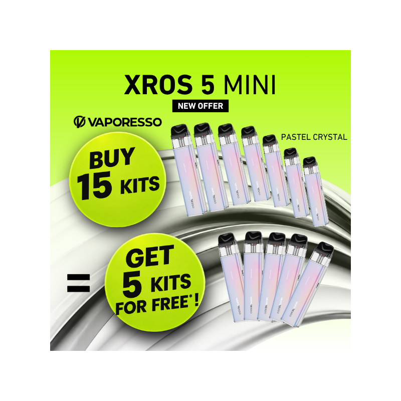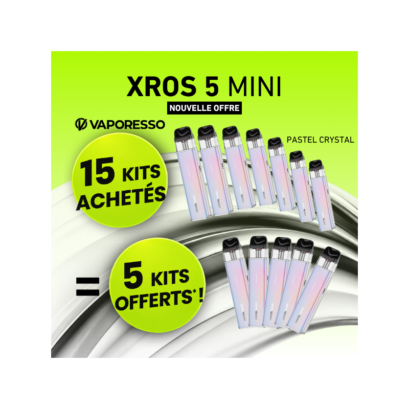 Pour l'achat de 15 Kits XROS 5 Mini de Vaporesso (couleur Pastel Crystal), recevez gratuitement 5 Kits de la même couleur. Soit 20 Kits pour le prix de 15 !