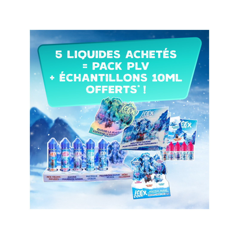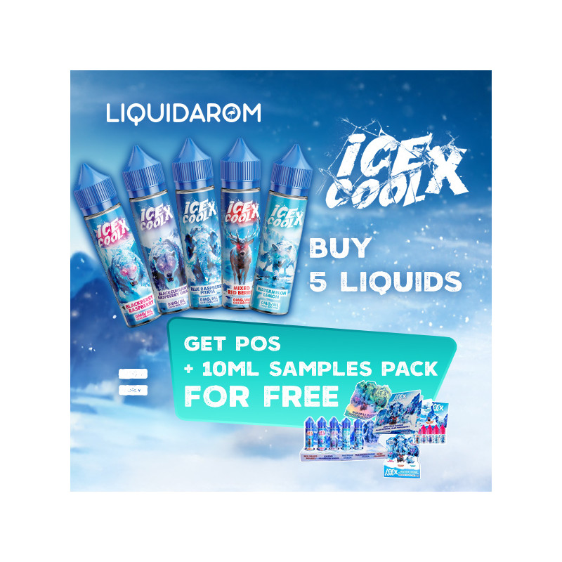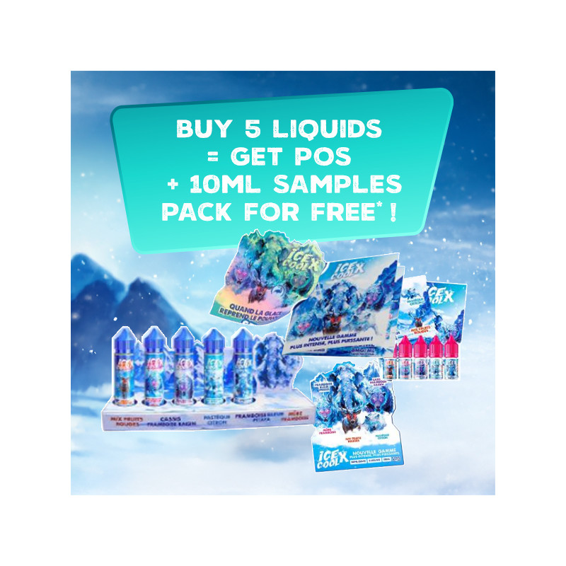 Pour l'achat des 5 liquides 50mL de la nouvelle gamme Ice Cool X de Liquidarom, recevez gratuitement un Pack PLV complet (Présentoirs, Stickers, Silhouettes comptoirs, etc..) ainsi qu'un Pack échantillon des 5 saveurs en format 10mL pour faire tester la gamme à vos clients !