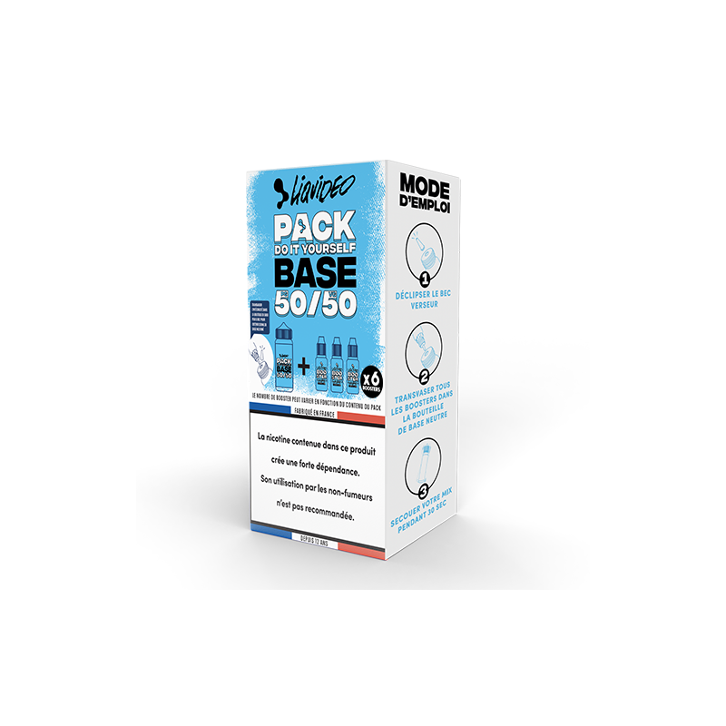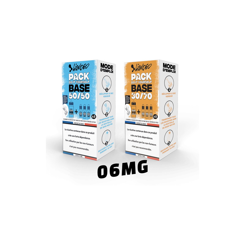 Inclus dans le pack 06mg 50/50 : x1 bouteille de base neutre 140mL 50/50 + x6 boosters en 20mg = 200mL en 03mg