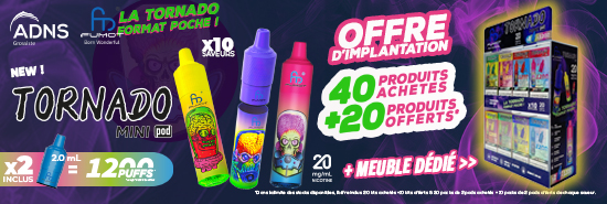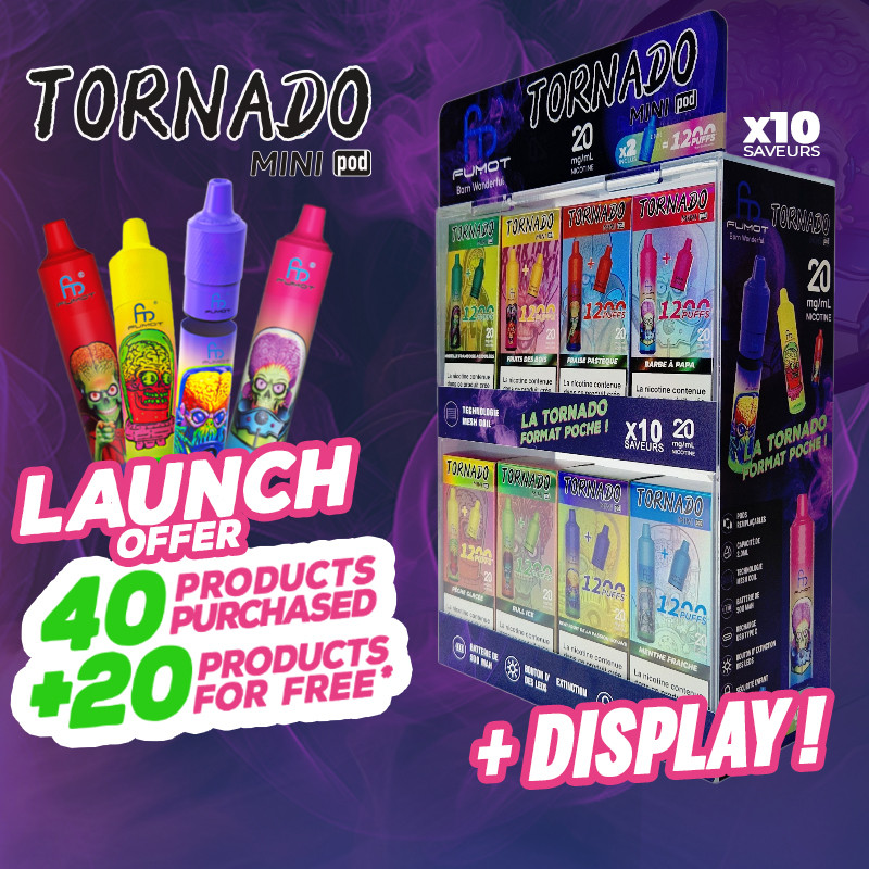 60 produits pour le prix de 40 ! Des kits et des pods de remplacement regroupant les 10 saveurs de la gamme à un tarif avantageux, rien de mieux pour satisfaire votre clientèle et mettre de la couleur dans votre point de vente avec un présentoir plastique monté dédié aux Tornado Mini !