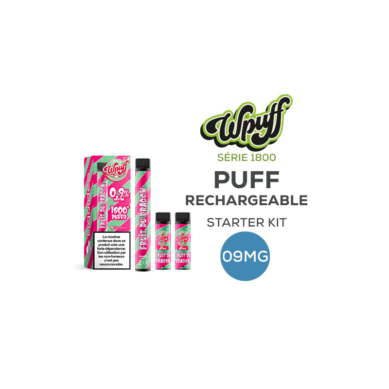 Découvrez ce kit Wpuff 1800 Pod contenant 0.9% de nicotine (9mg) avec une batterie de 550mah rechargeable et de deux cartouches de la même saveur.