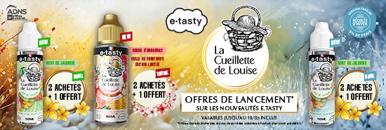 Pour l'achat de 2 nouveaux liquides 50mL Vert de Jalousie Récolte d'Hiver de la gamme La Cueillette de Louise by E.Tasty, le 3ème 50mL de la même saveur est offert*. Soit 3 liquides pour le prix de 2 !